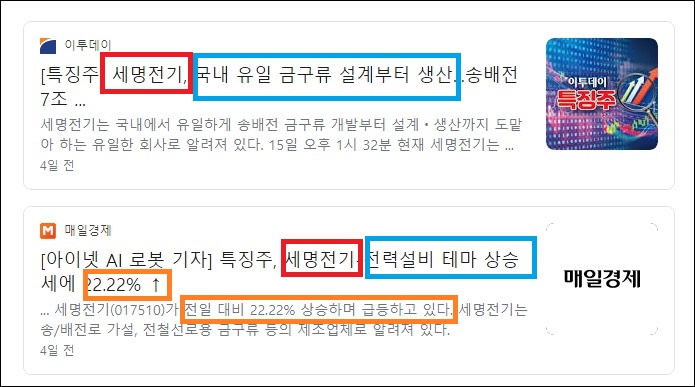 4일 전 세명전기 주가는 전일 대비 22.22%라는 급등을 보였던 적이 있는데요, 여름이라 그런지 관련 전력설비 테마주에 관심이 쏠린 적도 있던 것으로 보여집니다. 송/배전로 등의 업무는 여름철 블랙아웃이 우려되는 상황에 관련되어 있기도 합니다.