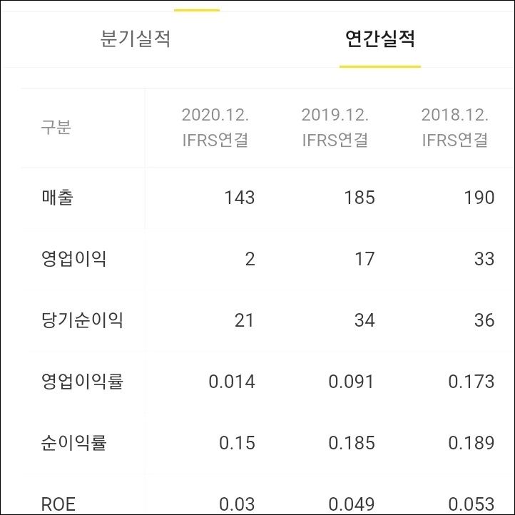 세명전기 연간 실적으로 볼 때 2020년 12월 IFRS 연결재무제표에 따르면 매출이 143억이었다고 합니다. 영업이익은 2억, 당기순이익은 21억이었습니다.