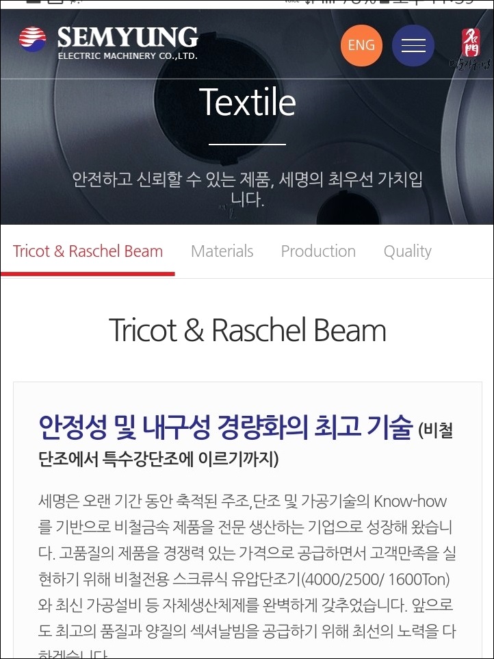 Textile으로 세명전기의 비철금속 제품 생산에 대한 내용입니다. 생산하는 비철 단조와 특수강단조는 선박, 항공기, 자동차 등 단조품에 아우르는 분야까지 관련이 있는 것으로 보이며, 생산 제품의 안전성이 향상된다면 세명전기 주가 전망에도 호재로 작용할 것으로 보여집니다.