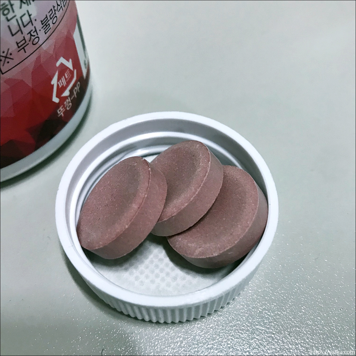 아직 한 통 다 안먹었는데 앞으로 열심히 살아야 하니까 계속 먹어줄 것입니다. 뚜껑에 살짝쿵 올려보았는데 사이즈가 생각보다 크네요. 여러분들께서 흔히 먹는 비타민C 그런느낌의 맛이나요.