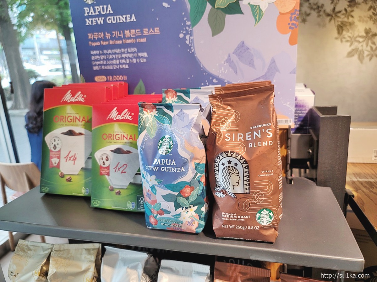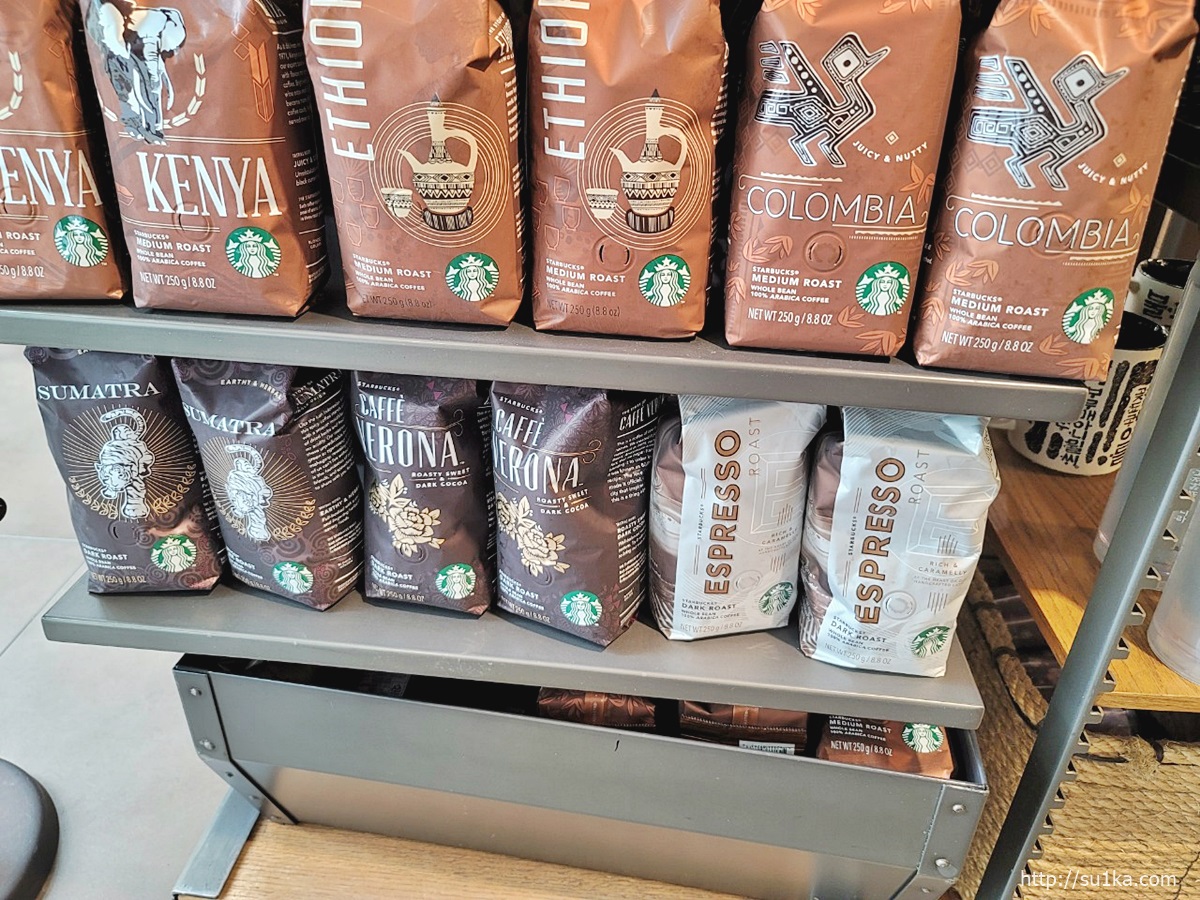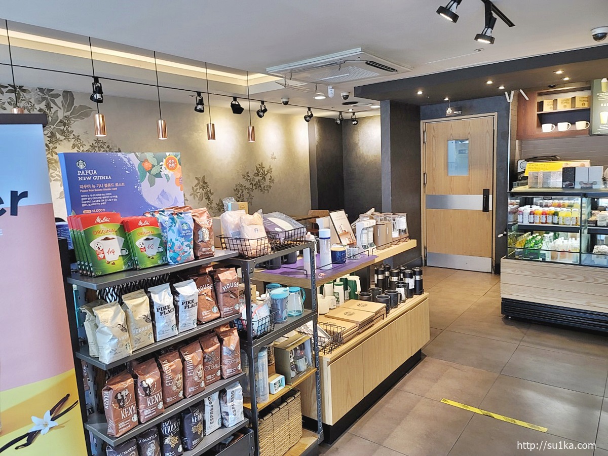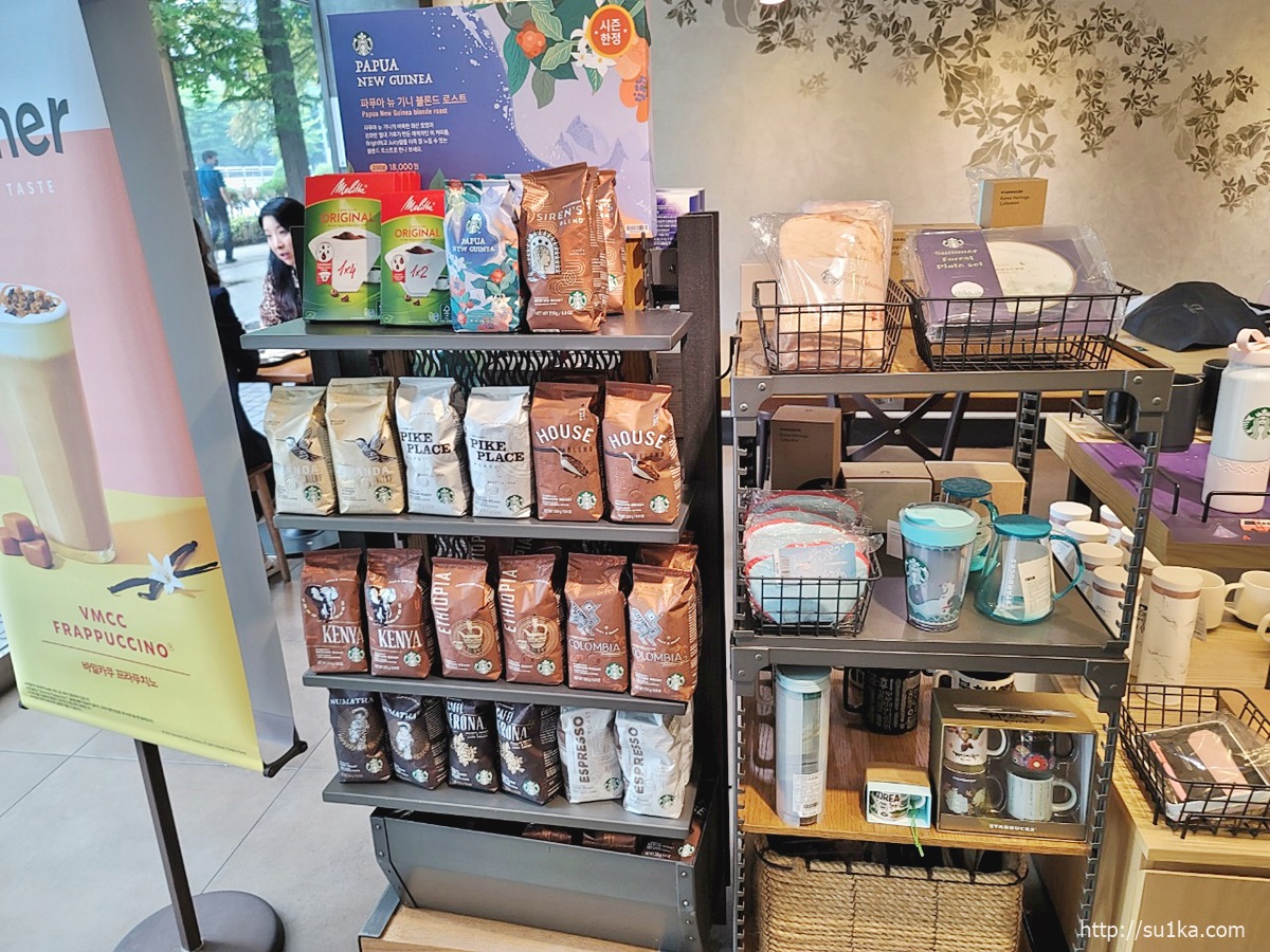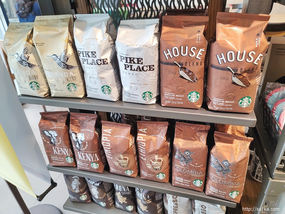 스타벅스는 입구에 MD상품과 함께 찾기 쉽게 원두가 진열되어 있습니다.