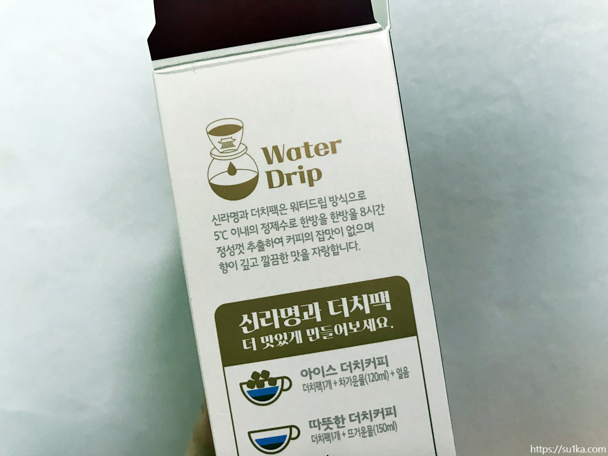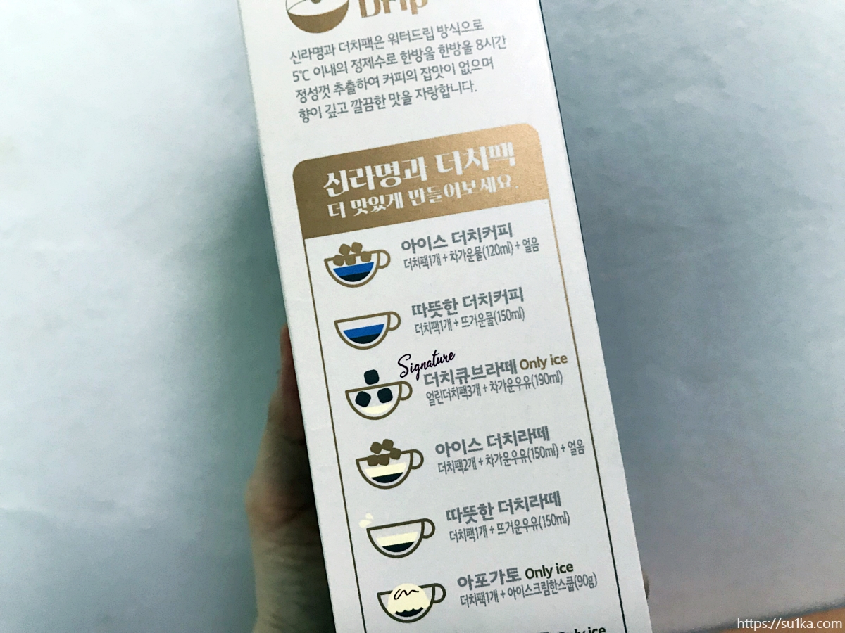 더욱이 저는 커피를 원체 좋아해서 집에 항상 각종 원두를 구비해 두거든요. 핸드드립 원두로 브루잉해서 먹는 커피의 맛이랑은 또다른 차원이 있는 신라명과 더치팩~~ 더치커피 파우치가 낱개별로 들어있어서, 양 조절에 실패하지 않는다는 '장점'도 많습니다.