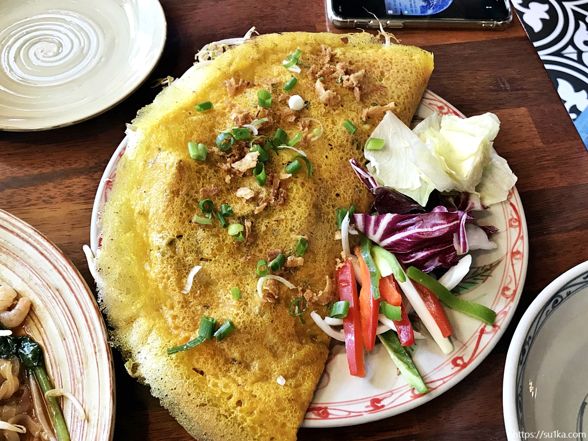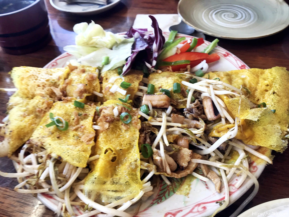 계란 지단이 반달모양으로 있는 이 녀석의 이름은 반세오입니다. 월남쌈이 조금 부담스럽다면 반세오를 주문해서 드셔보세요. 각종 야채가 채썰어져있고 안에는 숙주랑 고기같은것이 볶아져 있어서 아주 별미입니다. 저도 처음 먹어봤어요.