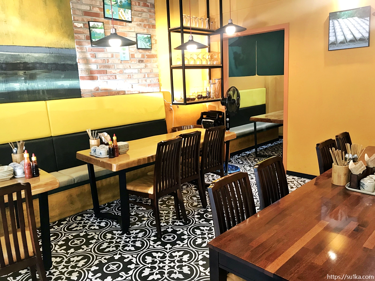 가게 내부는 노란색 인테리어로 되어있구요 바닥은 베트남 느낌 나는 타일이 깔려있습니다. 제가 노란색을 좋아해서 확 시선이 갔네요.