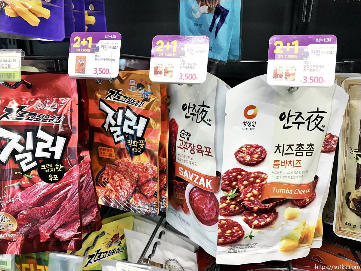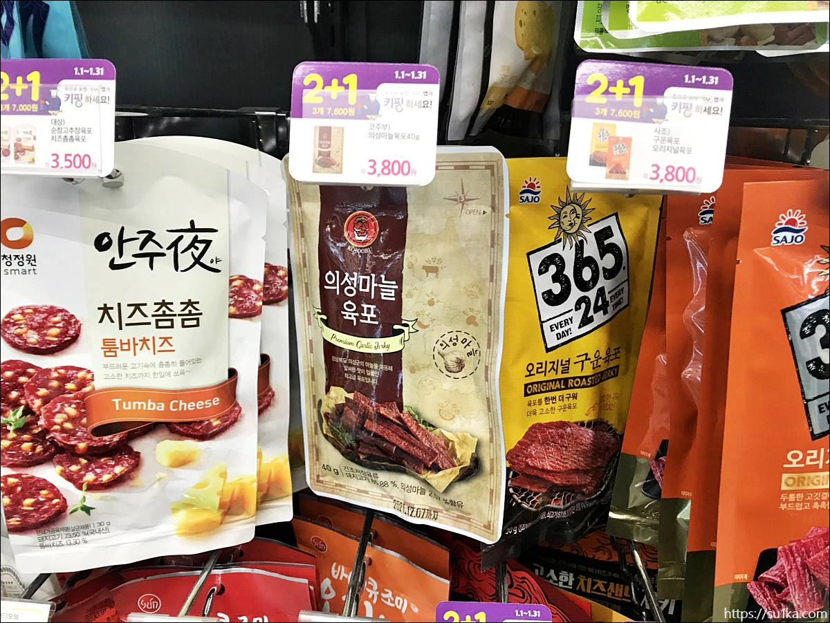 역시 맛깔난 육포가 2+1행사를 하고 있습니다.