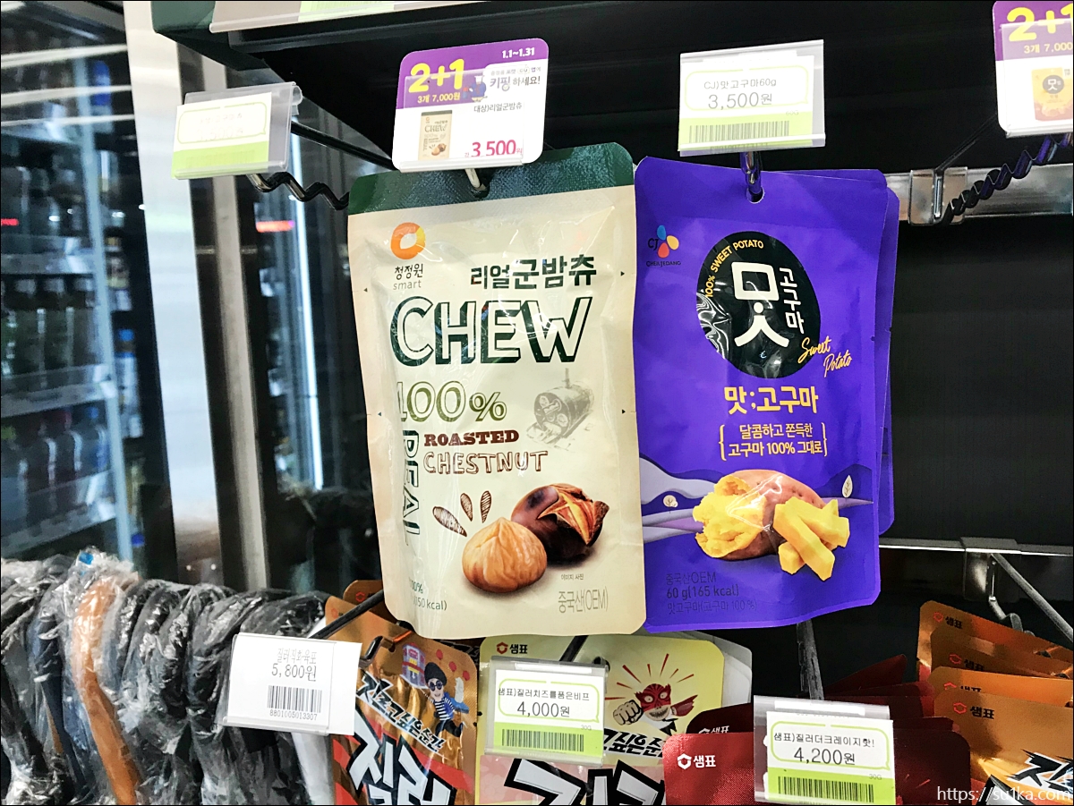 맛고구마는 하나에 3500원인데 세일을 안하고 있고, 리얼군밤츄는 하나에 3500원이지만 2+1행사를 하고 있어요. 청정원 제품으로 정말 쫀득하고 달콤한 밤의 맛을 느낄 수 있답니다.