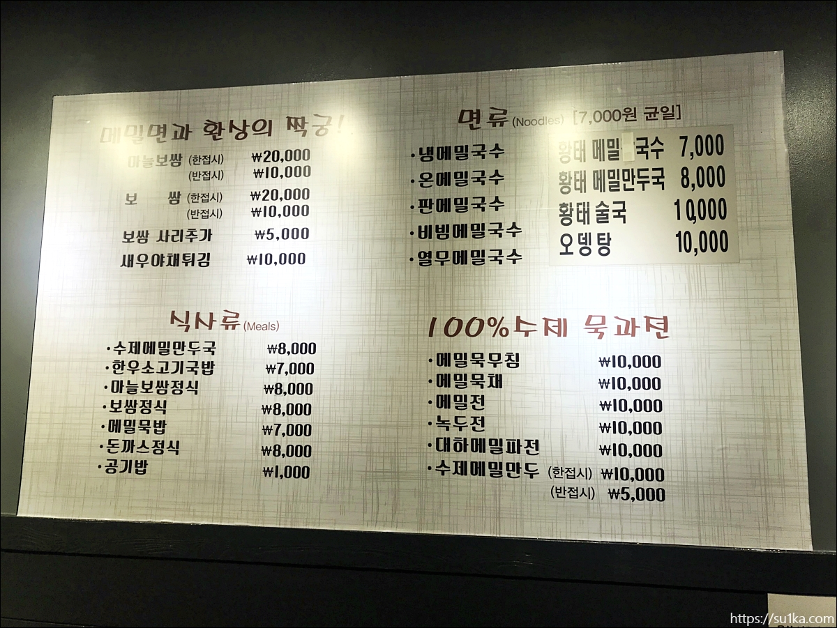미리 가격도 보고 시키세요~ 냉메밀국수 온메밀국수 뿐만아니라 판, 비빔, 열무 메밀 국수도 있는데요 정말 가격이 저렴해요. 7000원 정도니까 말이에요.