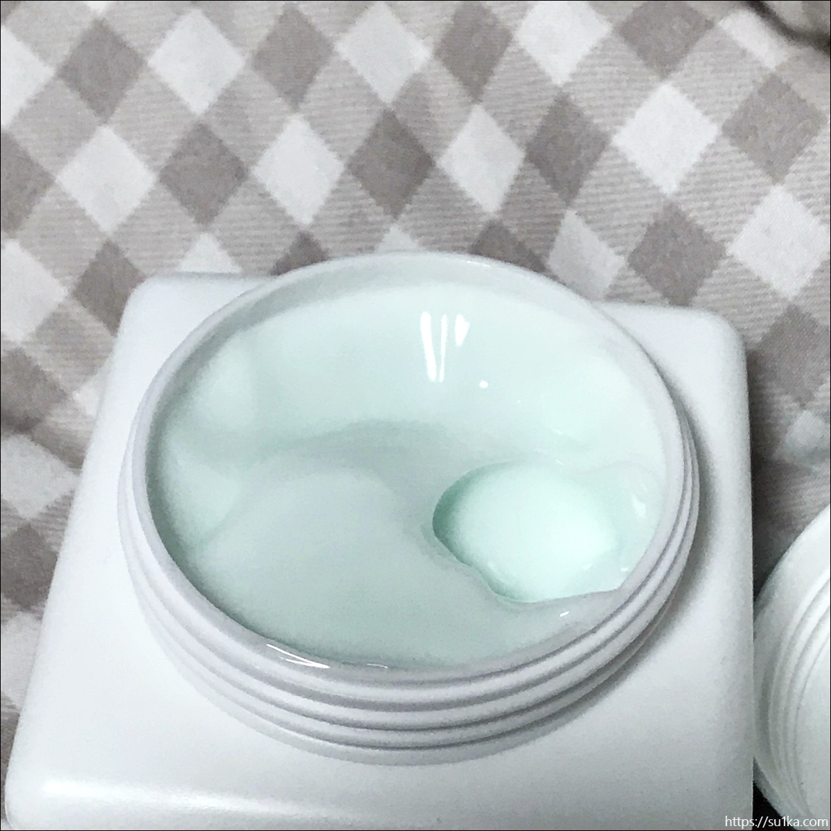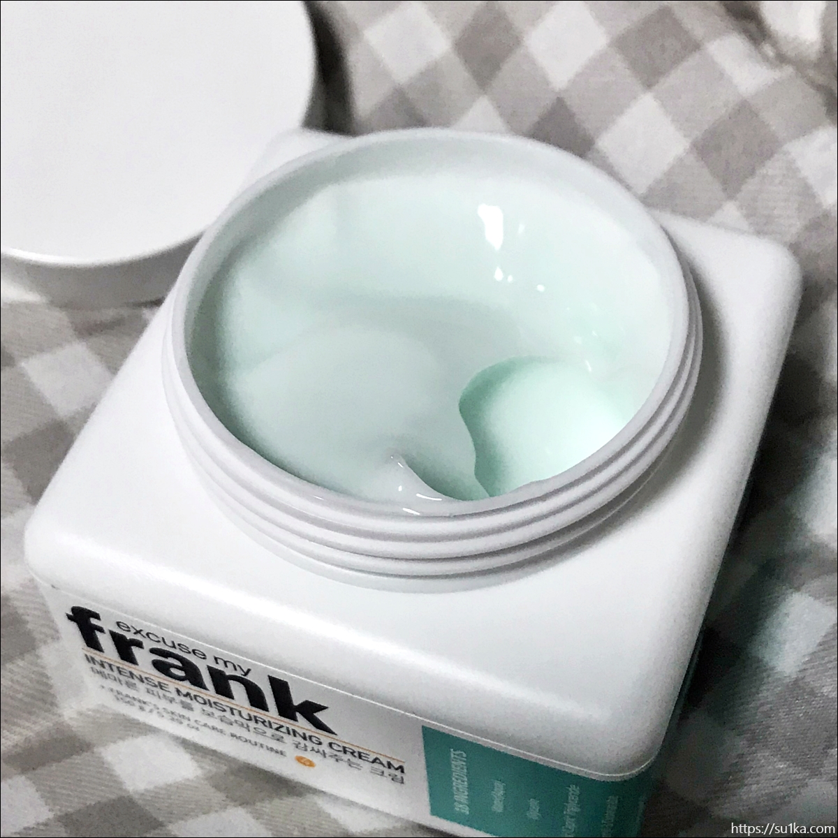프랭크 수분크림은 안에 살짝 초록빛이 나는 크림으로 채워져 있었습니다. 언뜻 먹는거 같기도 하고요..치약 색깔 같기도 하고요. 하지만 향은 아주 부드러운 향이 나며 순한 것이 느껴졌습니다.