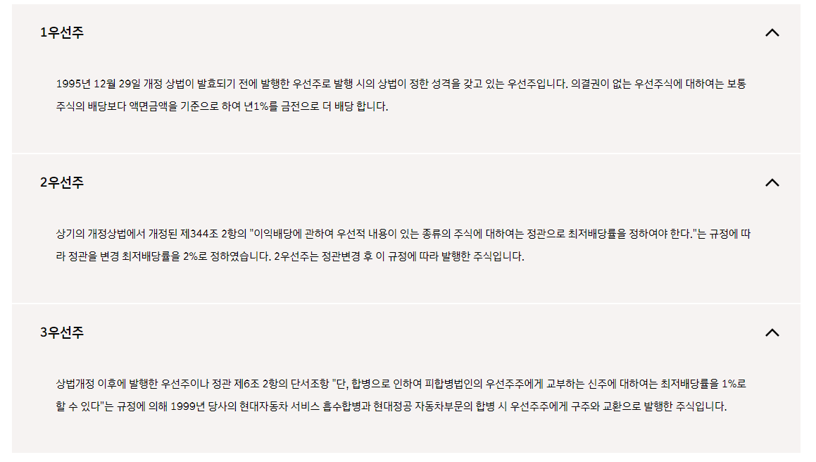 . 현대차우는 이름그대로 현대차의 우선주이며 발행도 제일 먼저 되었습니다. 우선주에는 의결권이 없습니다. 주주총회시 찬/반의견을 낼 수 없는 것입니다. 하지만 본주 배당액보다 액면가의 1%를 더 배당받을수가 있습니다.