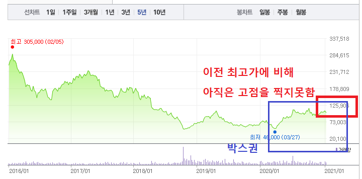 2016년 1월 최고가 305,000원에 비하면 아직까지 고점은 찍지 못했지만 최저가 46,000원에 비하면 2배이상 높은수치입니다.