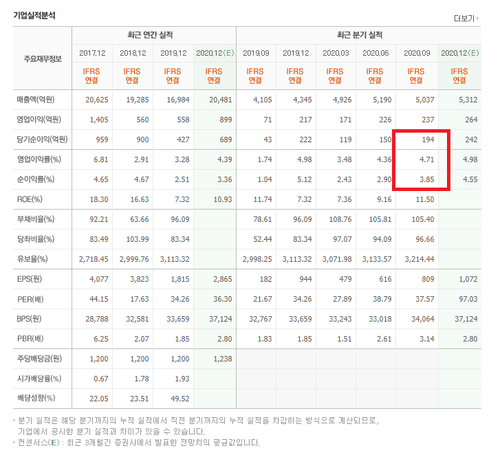 기업실적을 분석해 보았습니다. 2020년 12월 분기실적은 나오지 않았지만 최근 연간실적이 항상 흑자였으며 분기실적중에서 최근 당기순이익/영업이익률/순이익률이 +입니다.
