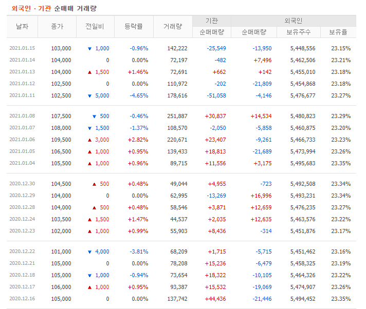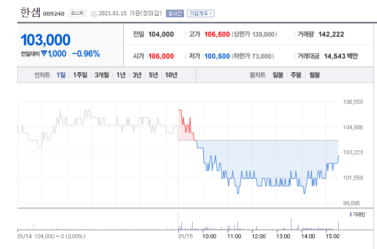2021년 1월 15일 기준으로 1주당 10만 3000원의 가격을 호가하고 있습니다.