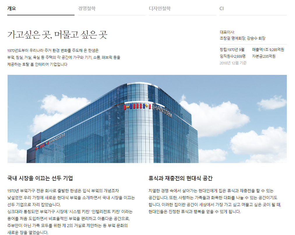 기업 설명을 읽어보니, 한샘은 부엌가구 전문 회사로 출발해서 인테리어 전영역을 커버하게 되었다고 하네요.