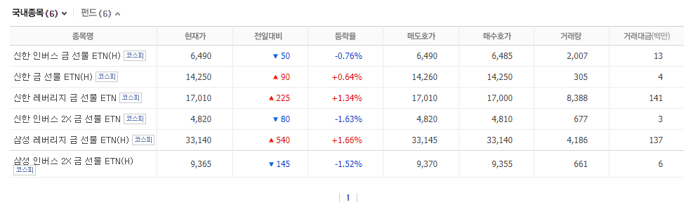 신한 인버스 금선물 ETN (H), 신한 금선물 ETN (H), 신한 레버리지 금 선물 ETN, 신한 인버스 2X 금 선물 ETN, 삼성 레버리지 금 선물 ETN(H), 삼성 인버스 2X 금 선물 ETN (H)가 있습니다.