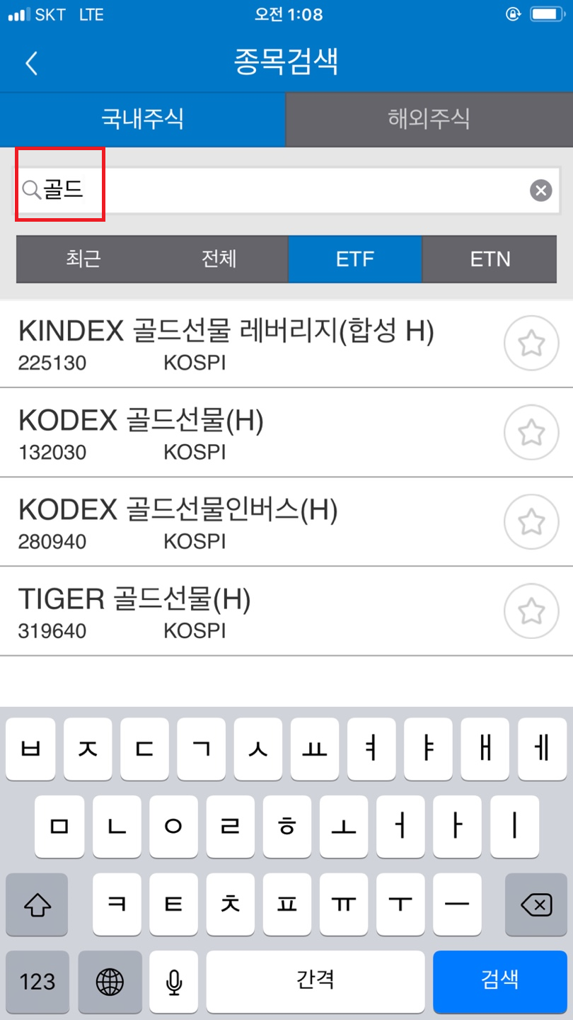 골드라고 검색하니 KINDEX 골드선물 레버리지 (합성 H), KODEX 골드선물 (H), KODEX 골드선물인버스 (H), TIGER 골드선물 (H)가 보입니다.
