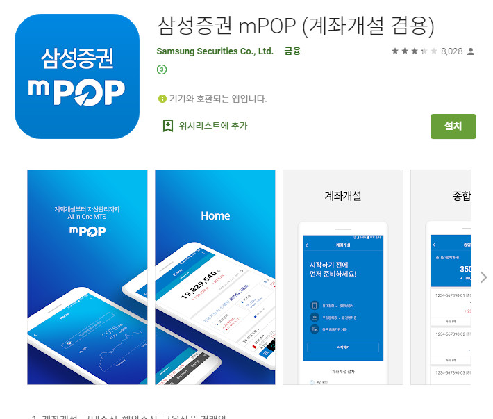 삼성증권 mPOP 계좌개설 겸용 앱을 다운받아줍니다