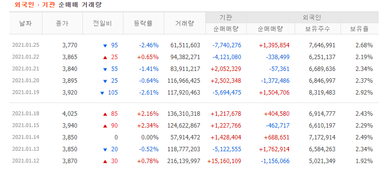 1월 12일부터 25일까지 외국인, 기관 순매매 거래량입니다.