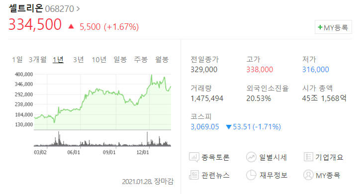 주가는 28일 장마감기준 334,500이었고 1.67% 상승을 하였습니다.