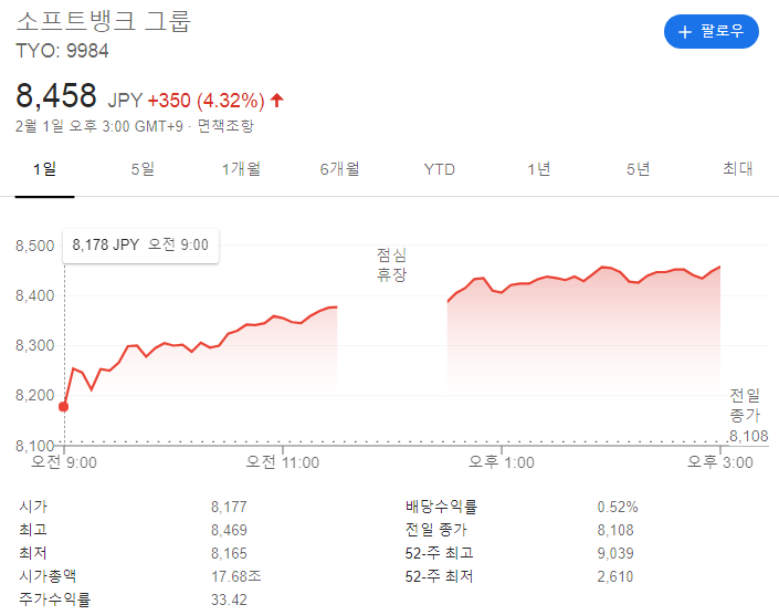 소프트뱅크 그룹 사의 한주당 가격은, 8458 엔,이며 시가총액 17.68조 입니다.