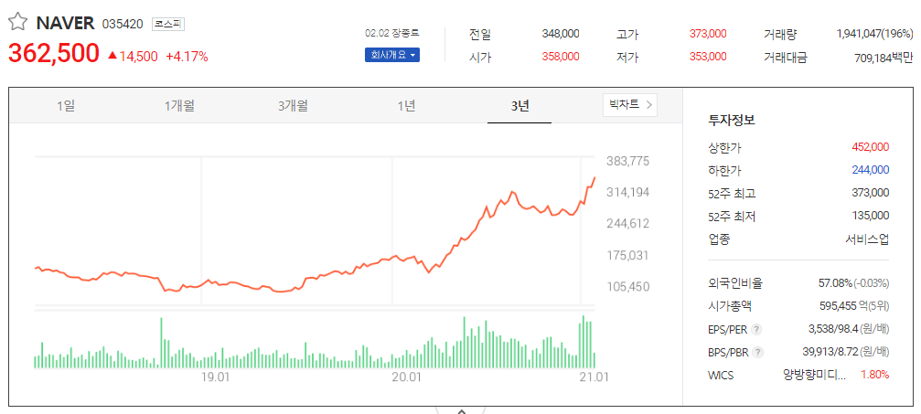 네이버 주가는 현재 1주당 362,500원이며 2월 2일 +4.17%가 올랐습니다. 외국인비율이 57.08%입니다.