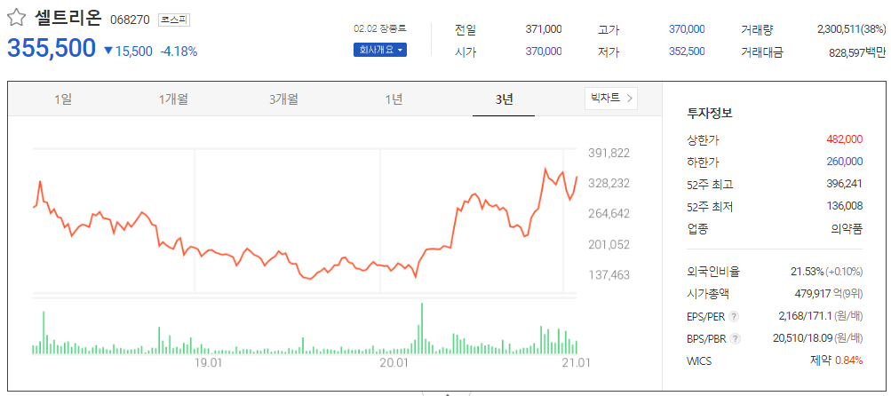의약품/ 제약관련 회사 셀트리온입니다. 외국인비율이 21.53이며 시가총액은 479,917억으로 9위입니다. 주당가격은 355,500원으로 전날대비 4.18%하락하였습니다.