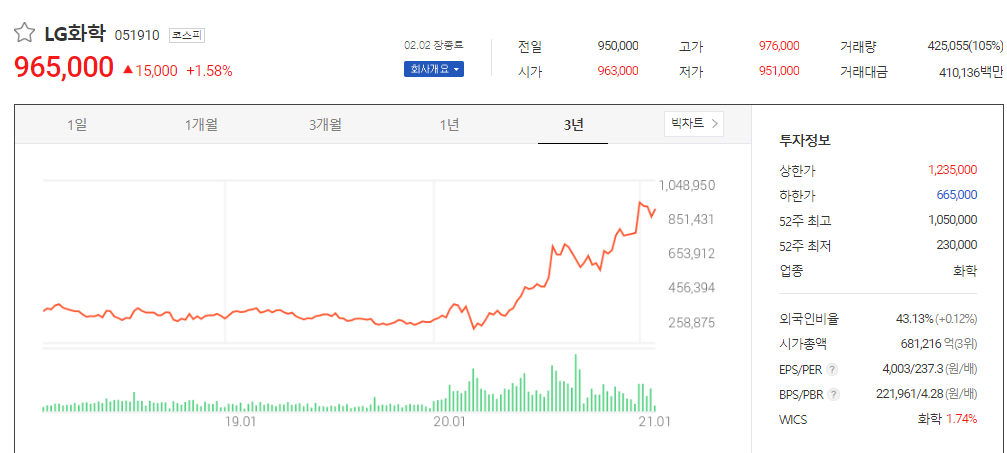 LG화학 주가는 2월 2일 장마감기준 965,000원이며 3년치 차트로 볼때 근1년간 꾸준히 상승해온 것으로 보여집니다. 외국인비율이 43.13%이며 시총은 681,216억으로 코스피 3위입니다..