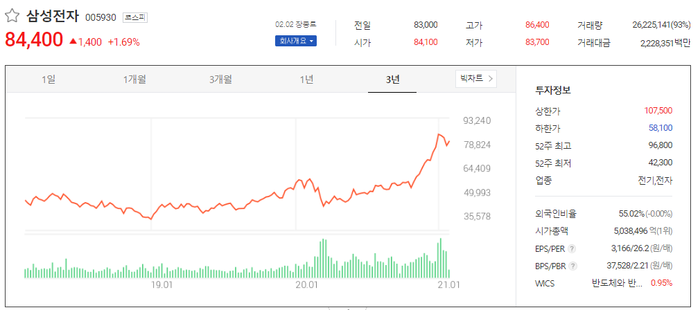 삼성전자입니다. 10만전자 고공행진 신화가 이어질지 아닐지 전망이 궁금합니다. 1월엔 박스권이며 2월 소폭상승, 3년치 차트로는 꾸준한 오름세가 보여집니다. 2월 2일 장마감기준 주당가격 8만 4천 400원입니다. 외국인비율은 55.02%입니다.