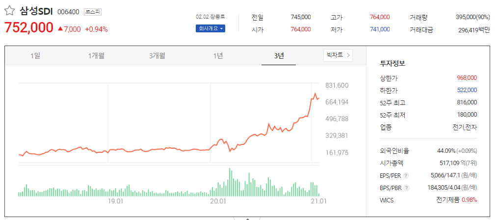 또 삼성입니다. 삼성SDI 3년치 차트인데요 박스권에서 소폭상승하다가 최근 급상승했고요 전기차/ 반도체 관심있으신 분들에 의해 좀더 주목을 받아왔습니다. 외국인비율은 44.09%고 시가총액은 517,109억으로 7위입니다. 1주당가격은 +0.94% 올라 752,000원입니다.