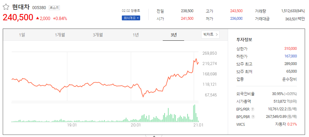 요즘 전기차 관련주로 언급되기도 하는 현대차입니다. 1주당가격 240,500원이며 2월 2일 장마감기준 +0.84%가 올랐습니다. 외국인비율은 30.95%이며 시총은 513,872억으로 8위입니다.