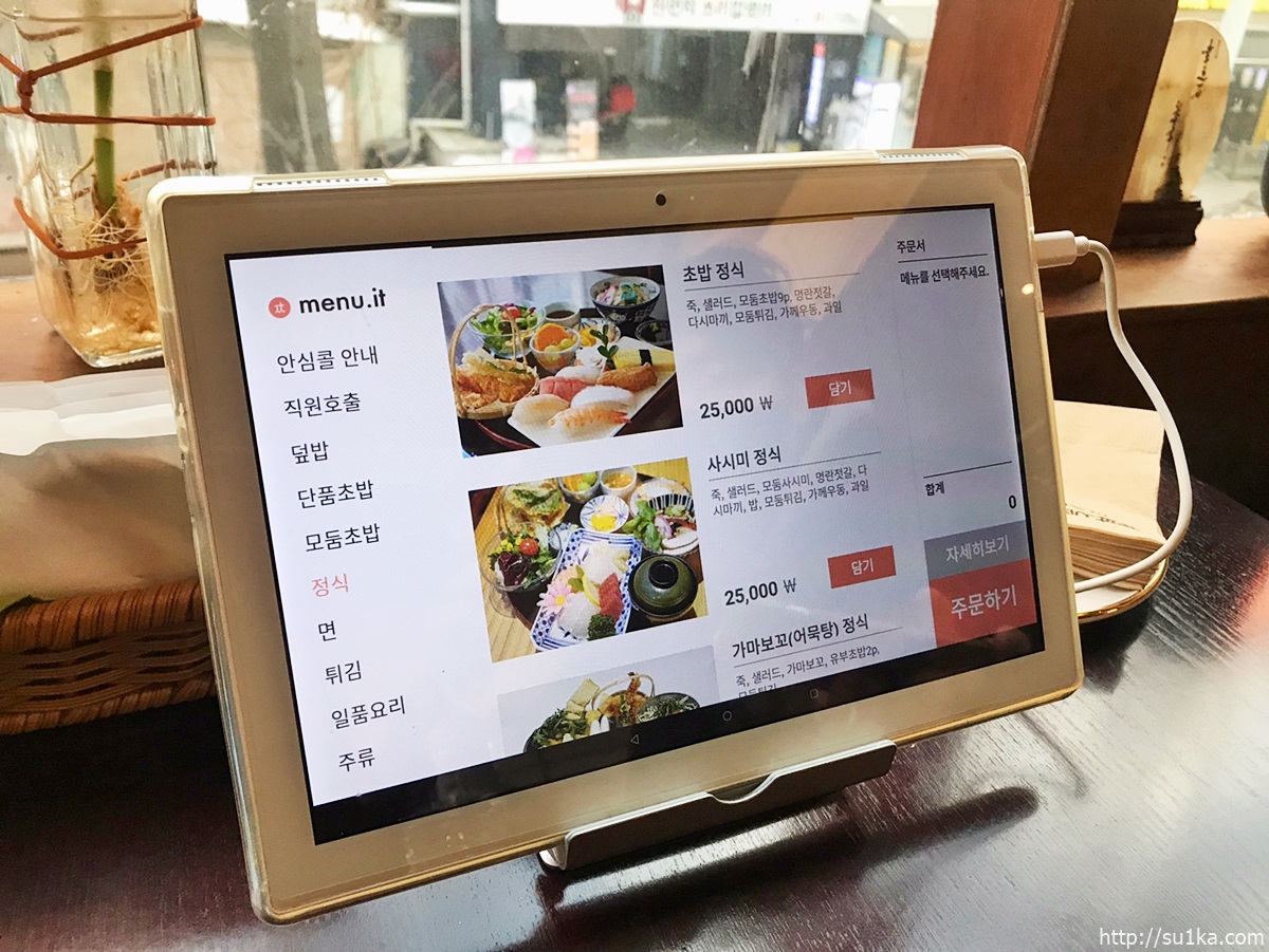 무인 주문기가 자리마다 설치가 되어있는데요 특히 사시미 정식이랑 초밥 정식이 너무 맛있어 보였어요.