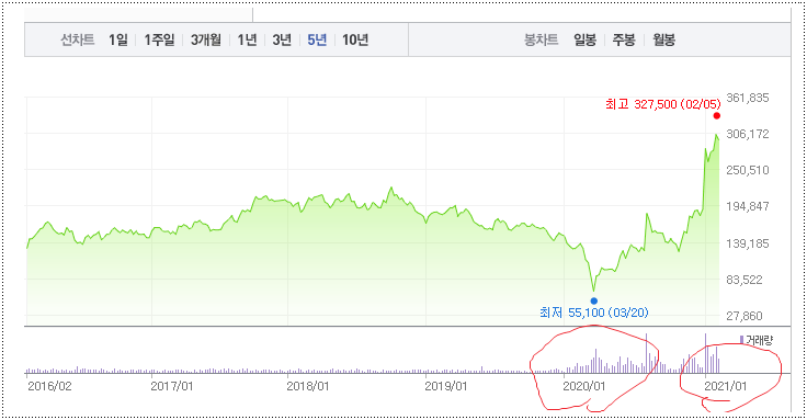 2020년 1월 최저점 55,100원에서 현재 주가 변동폭을 보면 괄목할 정도로 상승 했음을 알수 있습니다