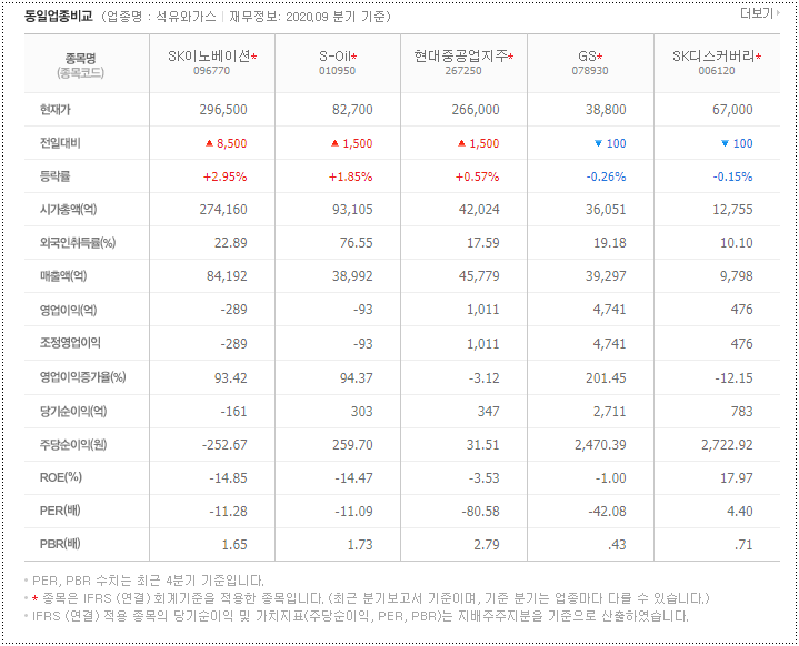 SK 이노베이션과 비슷한 동일업종 회사들입니다