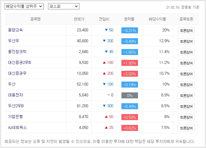 또한 다음 검색으로 21년 2월 10일 장종료 기준, 코스닥 배당금 상위주 리스트를 확인할수 있었는데요