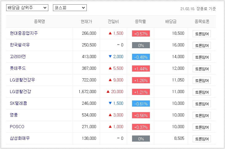 코스피 기준 배당수익률 상위주 리스트를 검색해 보았는데요