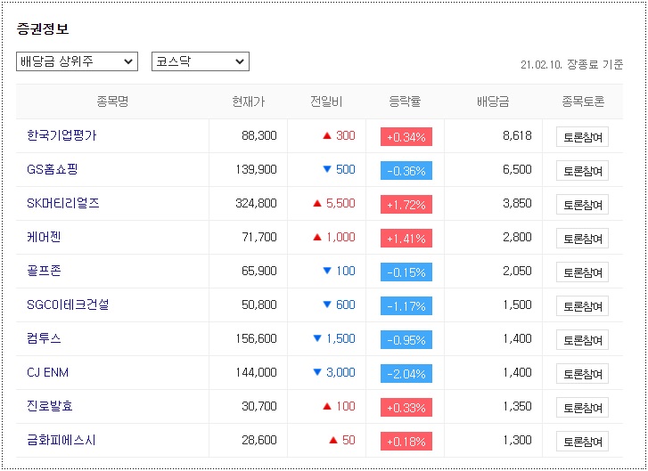또한 다음 검색으로 21년 2월 10일 장종료 기준, 코스닥 배당금 상위주 리스트를 확인할수 있었는데요
