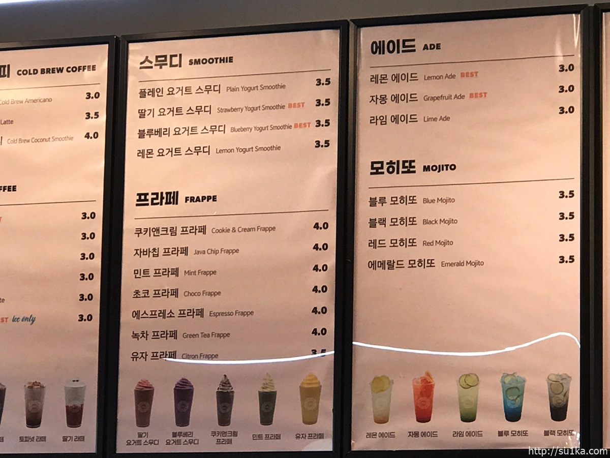 스무디는 플레인요거트, 딸기요거트, 블루베리 요거트, 레몬 요거트 스무디가 있었으며 가격은 각각 3500원이었고요 프라페는 쿠키앤크림, 자바칩, 민트, 초코, 에스프레소, 녹차 프라페가 각각 4000원, 유자 프라페가 3500 원의 가격으로 있었습니다.