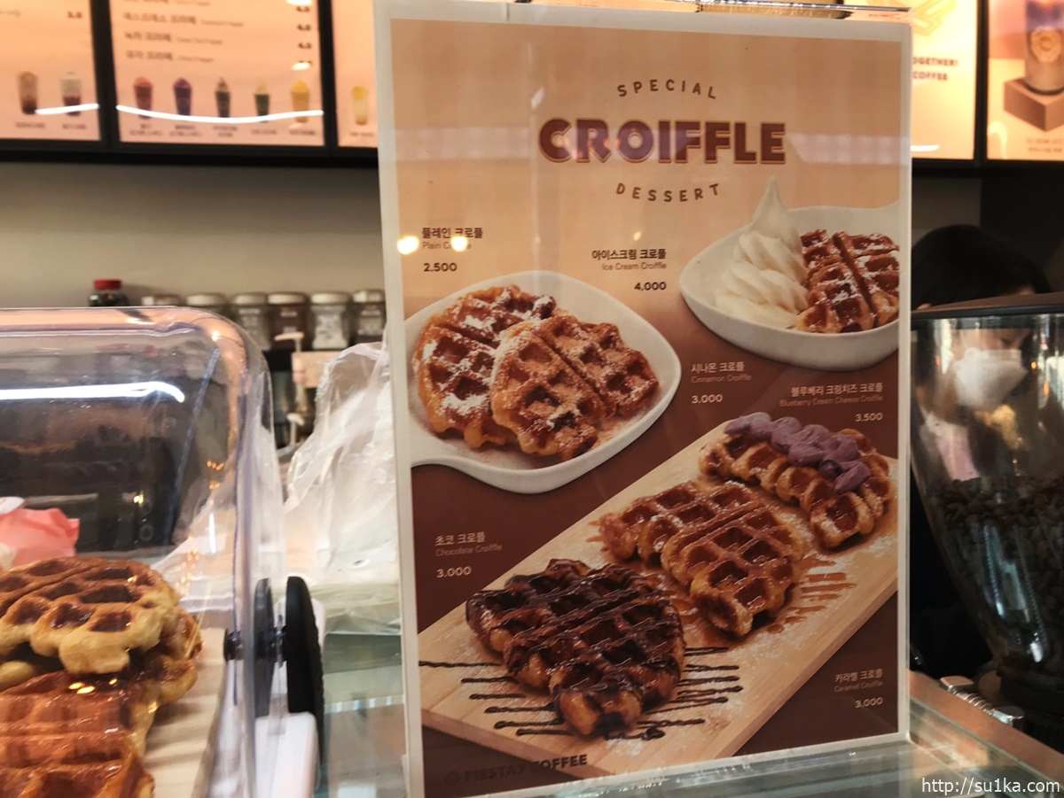 플레인 크로플 2500원, 아이스크림 크로플 4000원, 초코 크로플 3000원, 시나몬 크로플 3000원, 블루베리 크림치즈 크로플 3500원, 카라멜 크로플 3000원입니다.