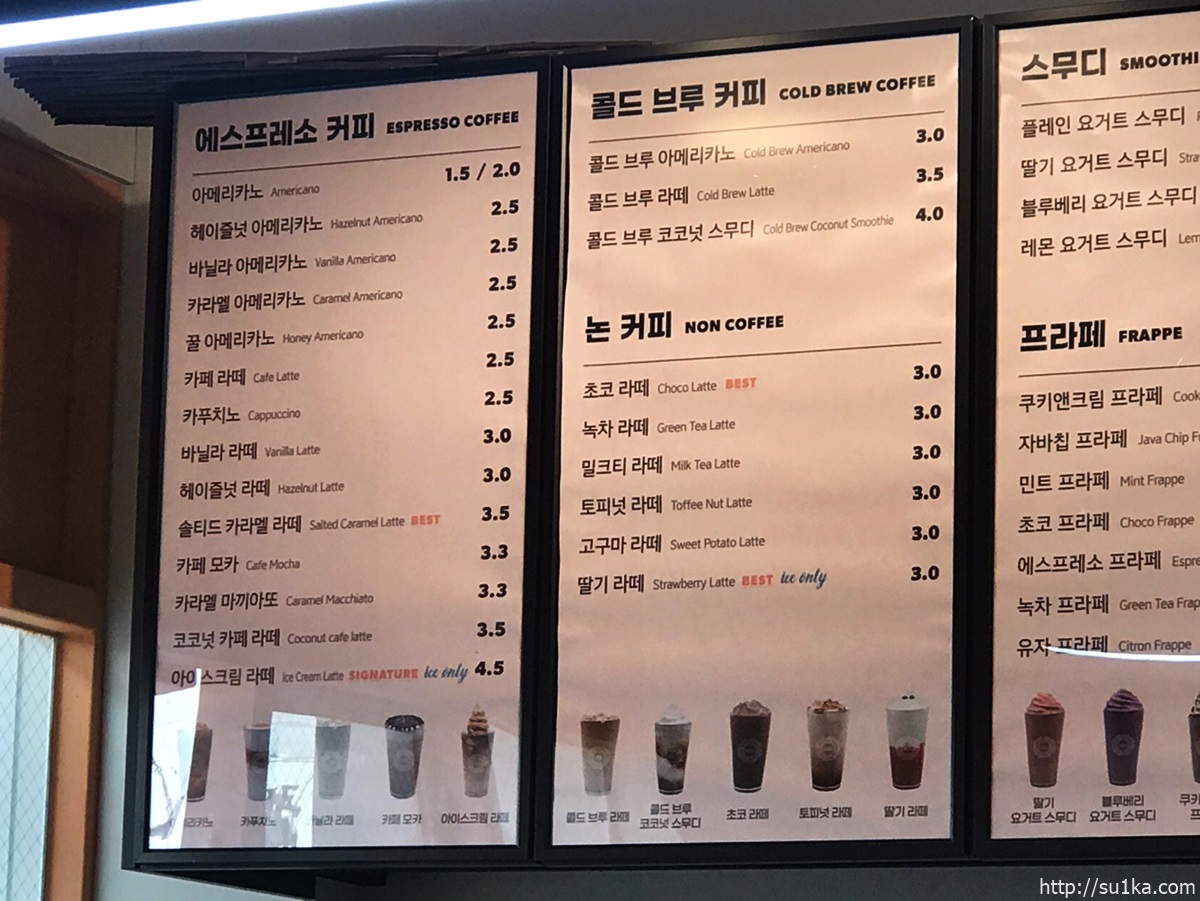 그 외의 커피종류로는 헤이즐넛 아메리카노, 바닐라 아메리카노, 카라멜 아메리카노, 꿀 아메리카노, 카페라떼, 카푸치노가 각각 2500원, 바닐라 라떼와 헤이즐넛 라떼가 3000원, 솔티드 카라멜 라떼 3500원, 카페 모카와 카라멜 마끼아또 3300원, 코코넛 카페 라떼 3500원, 아이스크림 라떼가 4500원이었습니다.