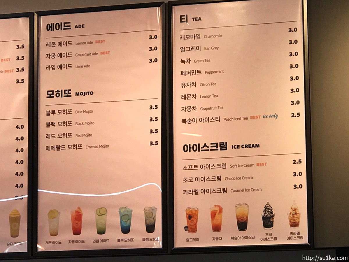 모히또는 블루, 블랙, 레드, 에메랄드 모히또가 있었으며 가격은 각각 3500원이었습니다