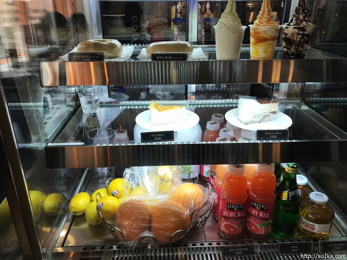 들어가자마자 쇼케이스를 살펴보았습니다. 단순 카페메뉴 뿐만 아니라 케잌류 라든지 아침에 먹을수 있는 베이글 류도 눈에 뜨이네요.