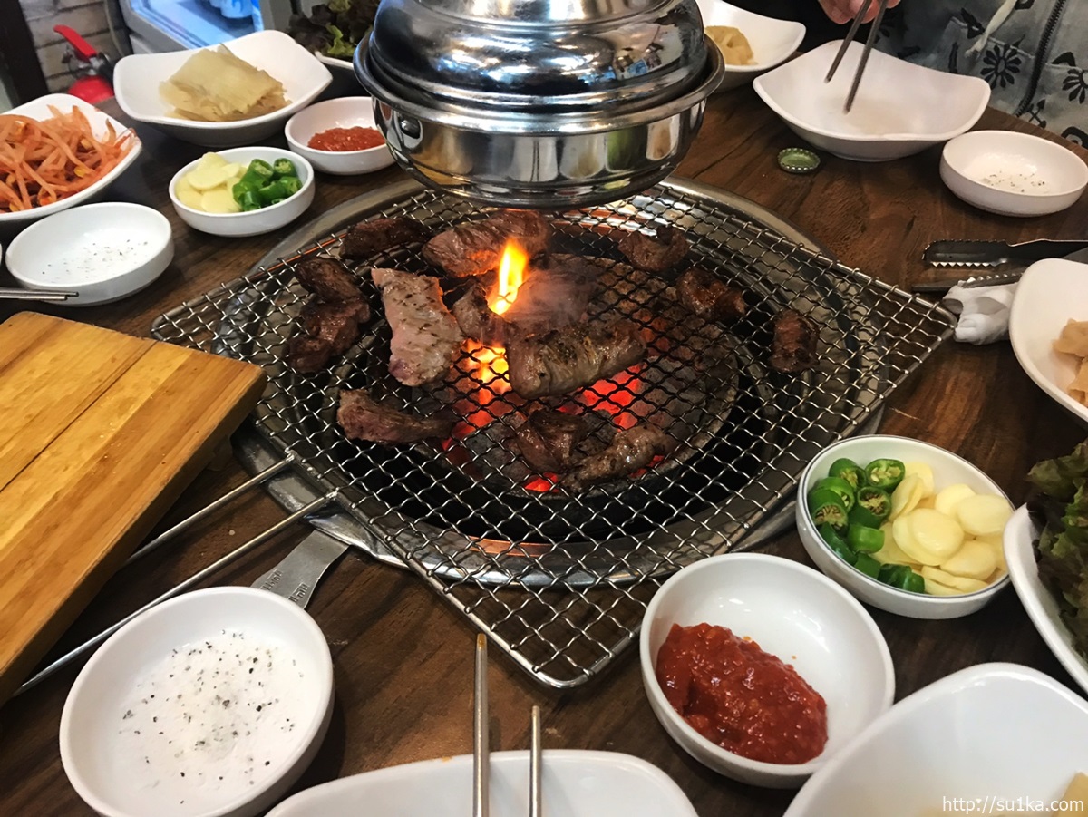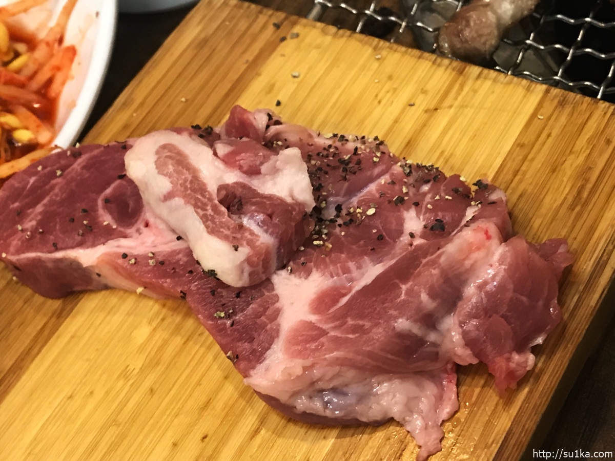 밑반찬으로는 백김치나 콩나물 등이 깔끔하게 나오는것을 알 수 있습니다. 고기는 질이 좋은 생고기라 소금에만 찍어 먹어도 맛이 좋았더랬습니다.