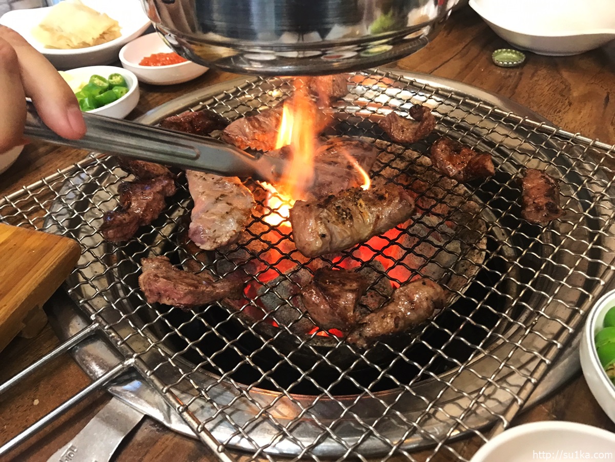제가 왔을 때 이미 고기를 굽고 있어서 이렇게밖에 못 찍었는데요 불판 좋아보이죠?